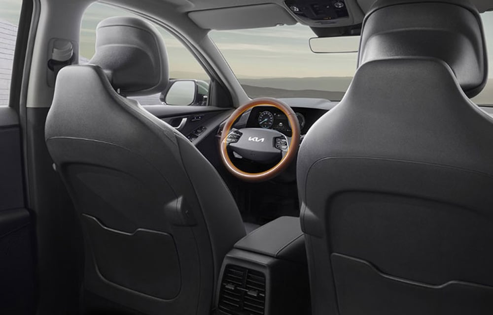 The 2024 Kia Niro EV interior has a contemporary feel with a sculptural design that incorporates recycled materials and natural fibres such as eucalyptus leaves for the headliner and upholstery. The Niro's cabin offers enough space for four adults and a cargo area that can handle large grocery runs. The vehicle's ambient interior lighting adds an upscale touch to the overall design, and the rotary shift knob is a nice feature. The cargo volume to the third row is 646 litres.